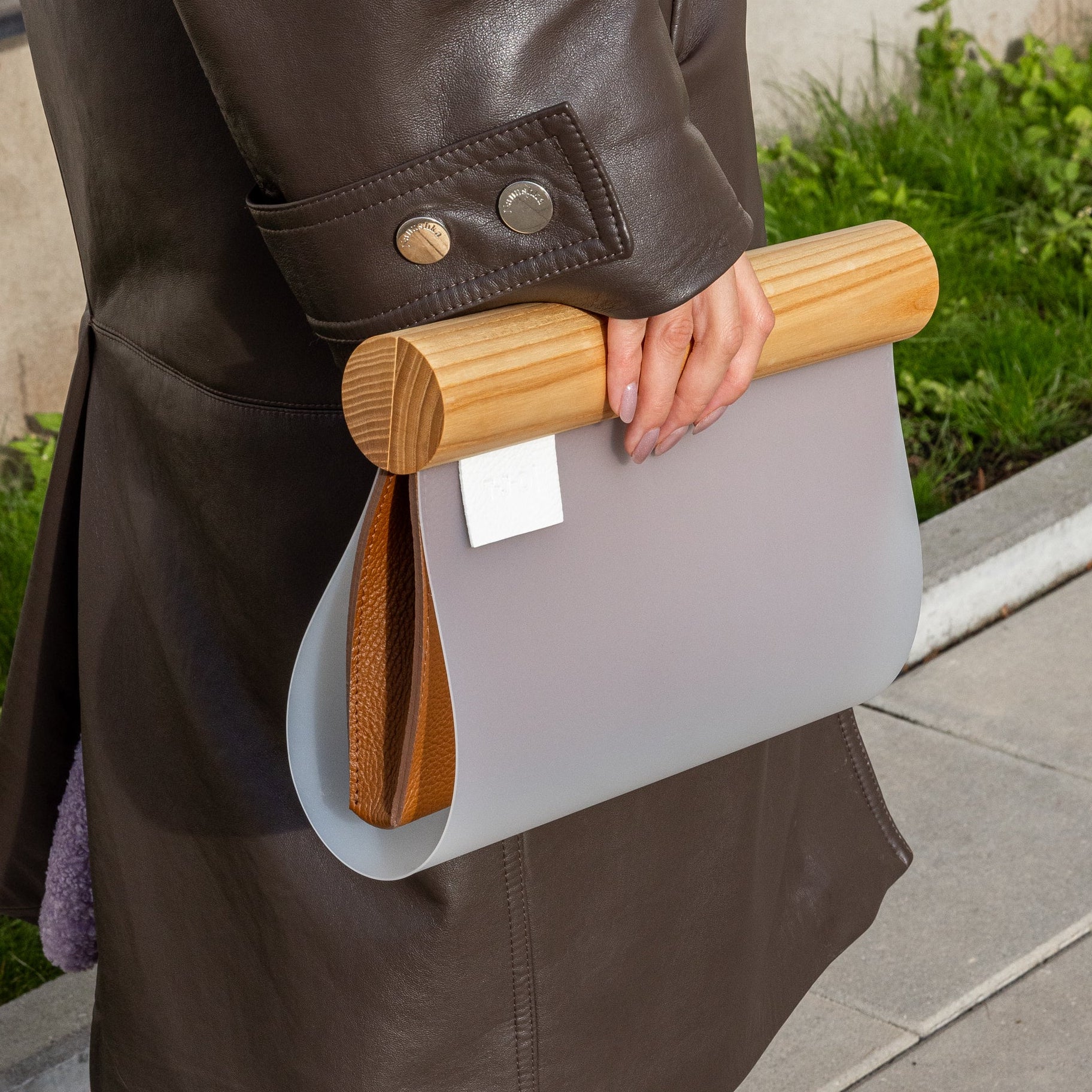 Designed with a leather case for elegance, a sturdy plastic shield for protection, and a carefully crafted wooden handlebar for a touch of natural personalization. T-J-O Balance is a practical accessory for carrying your everyday essentials and a statement piece that will elevate your day.