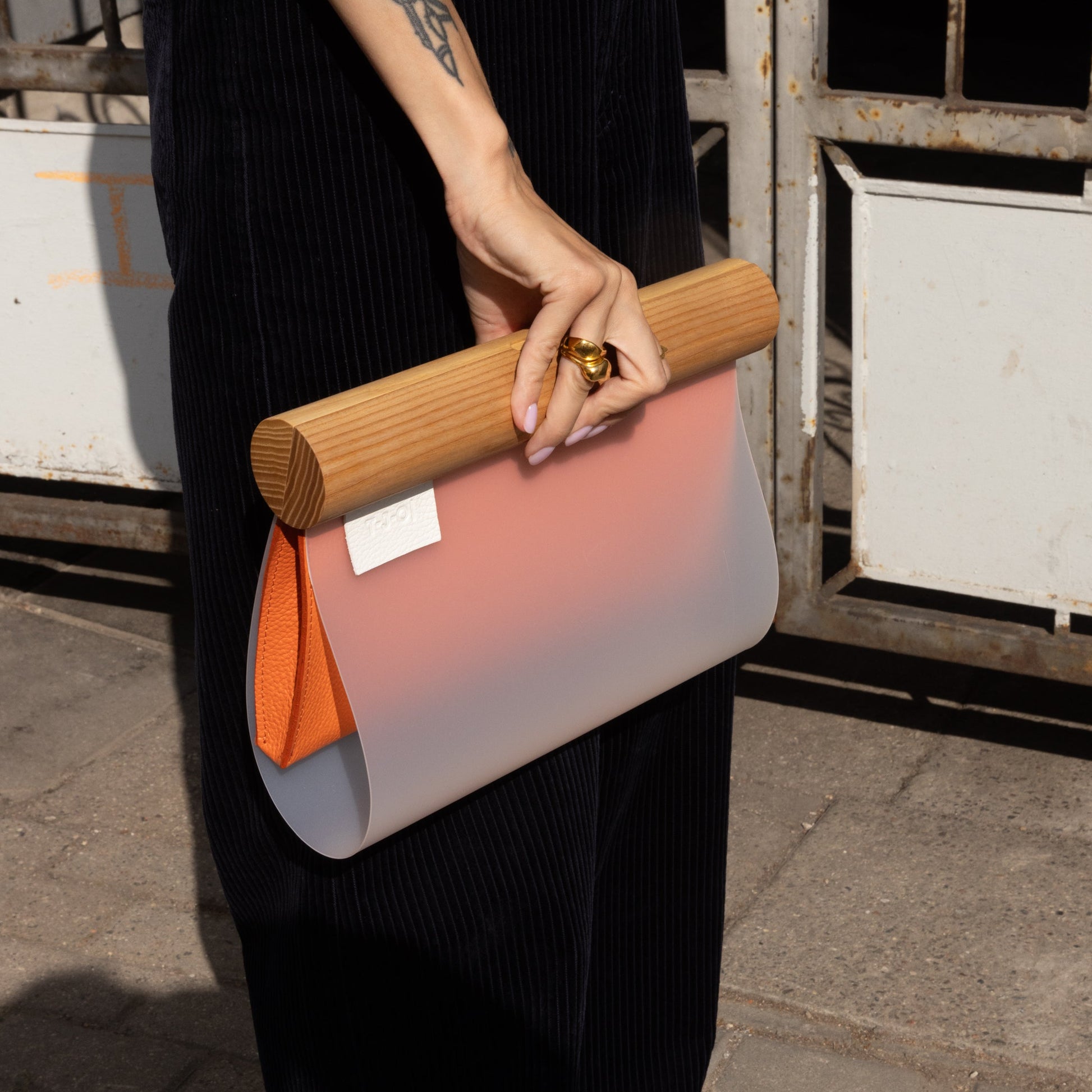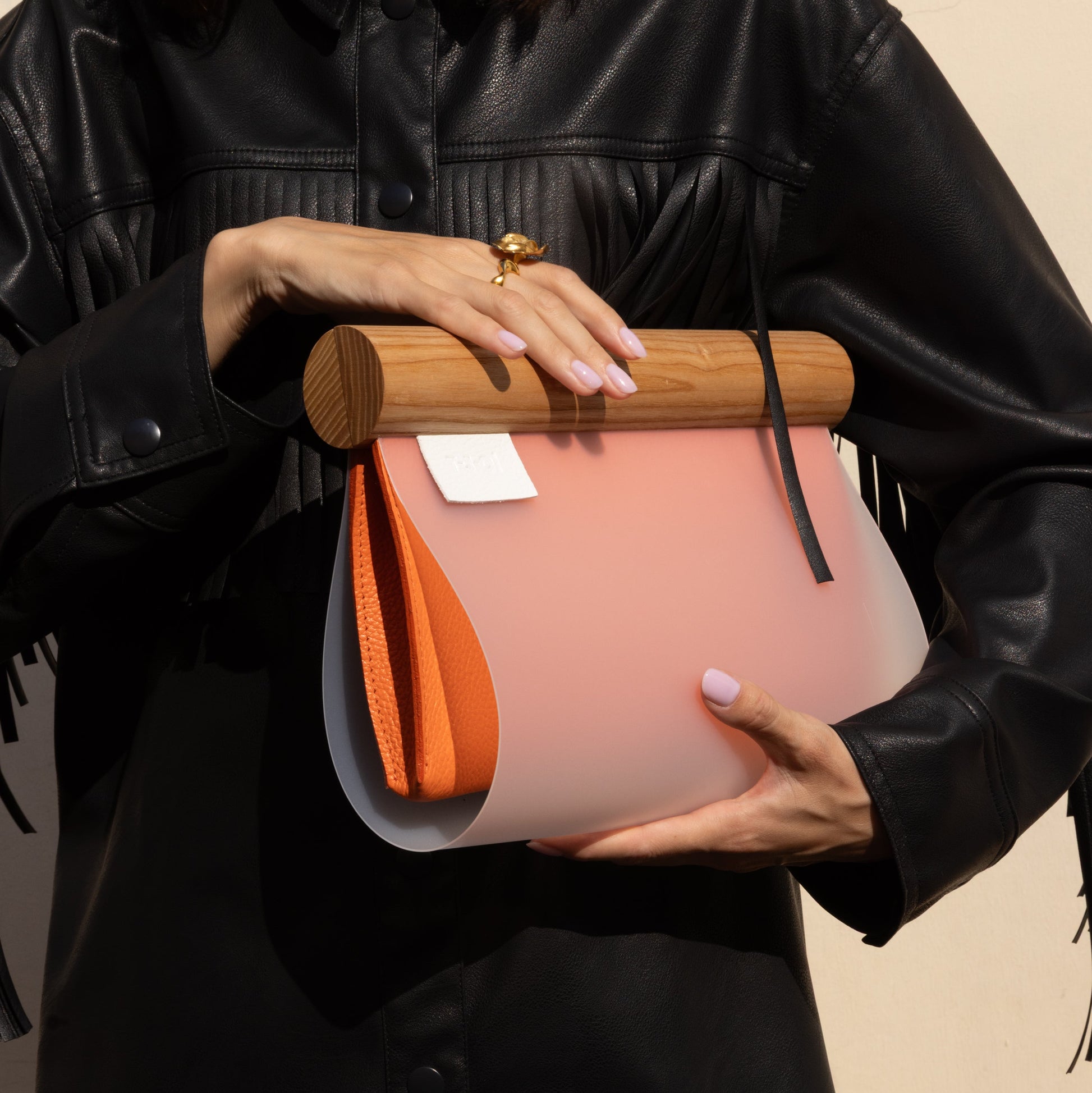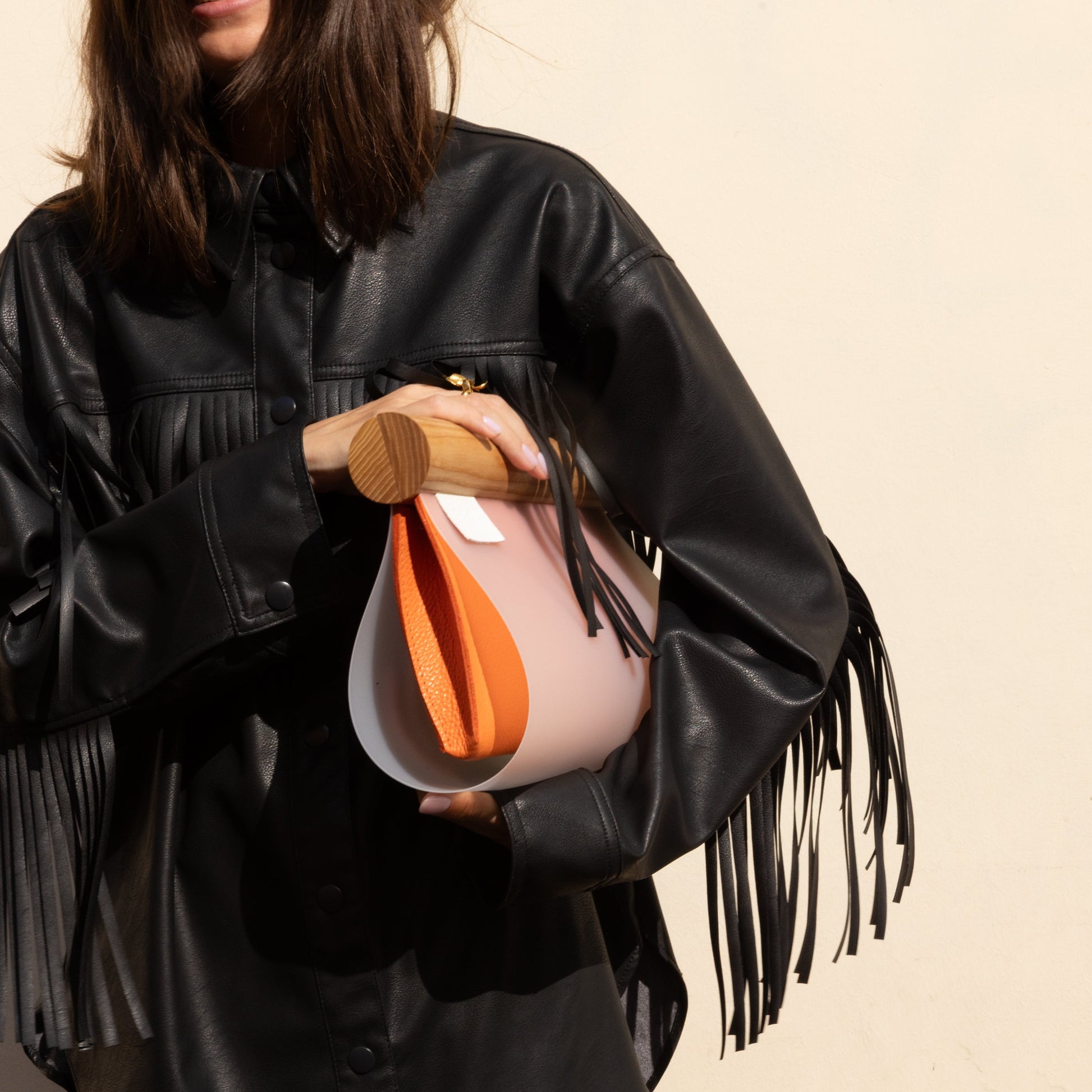 Designed with a leather case for elegance, a sturdy plastic shield for protection, and a carefully crafted wooden handlebar for a touch of natural personalization. T-J-O Balance is a practical accessory for carrying your everyday essentials and a statement piece that will elevate your day.